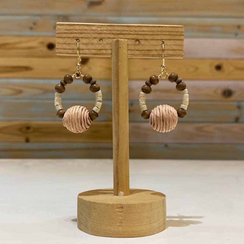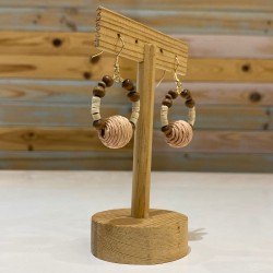 Pendiente con aro lleno de cuentas de madera de coco y pelota de papel rosado. enganche de pase con silicona para hacer tope.