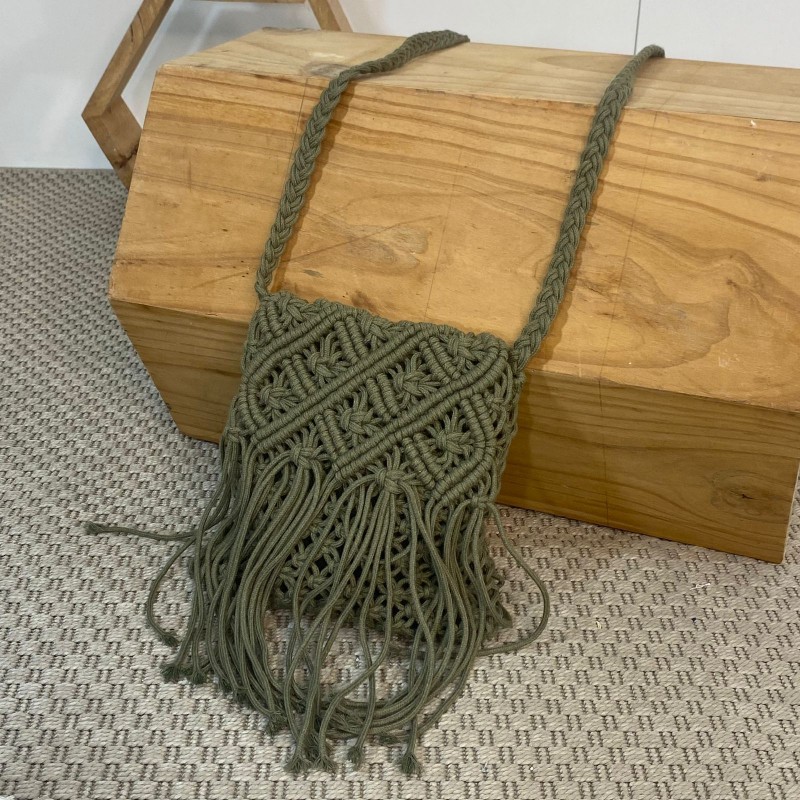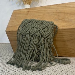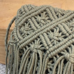 Bolso macramé en color caqui para colgar al hombro. Forro interior. Disponible en blanco.