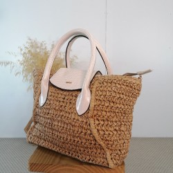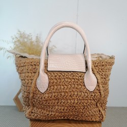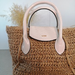 Este bolso tiene un diseño elegante que combina materiales naturales con detalles modernos. El cuerpo principal del bolso está tejido con fibras naturales como el papel teijdo formando una estructura de color marrón claro. El papel tejido tiene una textura visible, que le da una apariencia artesanal y natural.