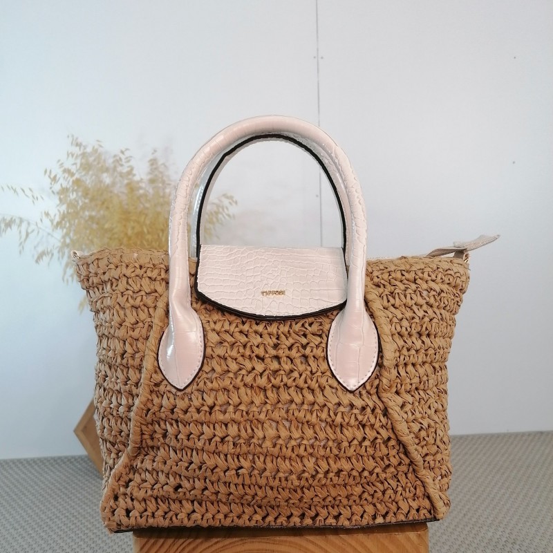 Bolso City efecto paja con piel sintética a contraste y solapa con cierre magnético. Asas de mano fijas y bandolera, ajustables y extraíbles. Cierre superior con cremallera, interior forrado y bolsillo interno con cremallera.