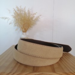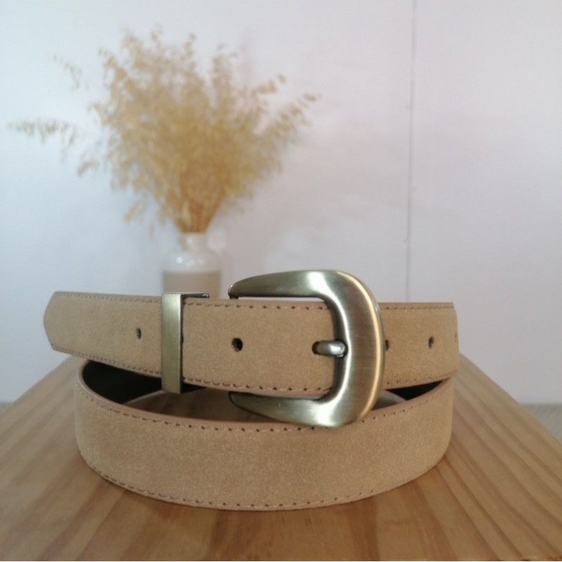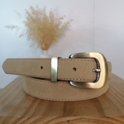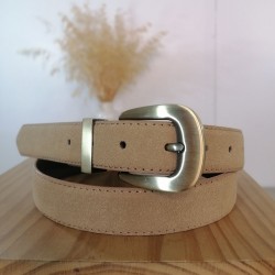 Cinturón beige para mujer, efecto ante, hebilla dorada mate.