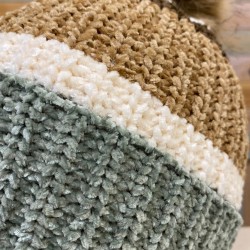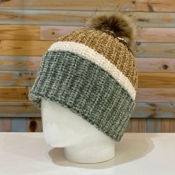 Ideal gorrito tricolor con pompón para ir bien calentita en el frío invierno. De tejido súper suave y amoroso, chenilla en colores verdes y arenas.
