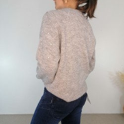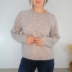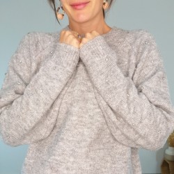 Este jersey gris perla ligeramente jaspeado es una de esas prendas que conquistan por su sencillez elegante. Su tono suave y luminoso se combina con un tejido agradable al tacto y unos pequeños brillantes en el escote y en las mangas que añaden un toque sutil de luz sin restar naturalidad.