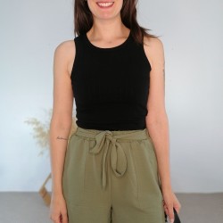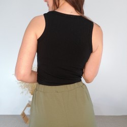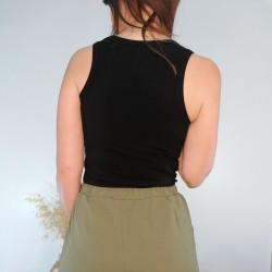 Este top de mujer en color negro es una monada, es de estilo nadador y queda por la parte de detrás un pelín mas largo y el bajo del top es con forma redondeada. Una vez puesto, este top de mujer negro se ciñe a la silueta quedando una prenda muy femenina. Tienes este mismo top disponible en color blanco con rayas en negro.